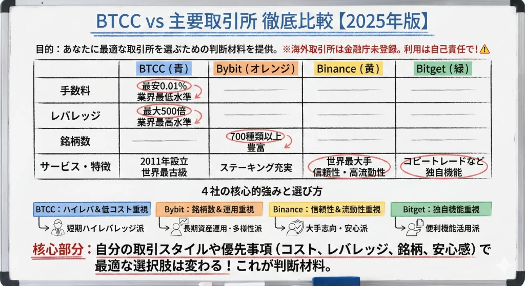 さらに、Bybit・Binanceなど主要4社との手数料・レバレッジ条件を比較表で整理し、出金トラブルの原因と安全に出金する5つのチェックリストも公開しています。