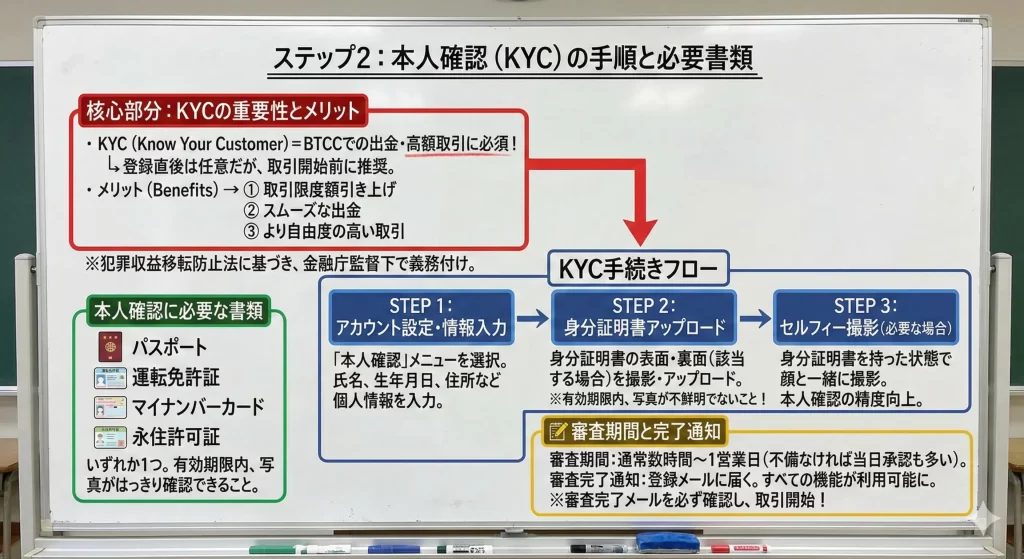 ただし、出金や高額取引を行うには本人確認(KYC)の完了が必須となるため、早めに手続きを済ませておくことを推奨します。