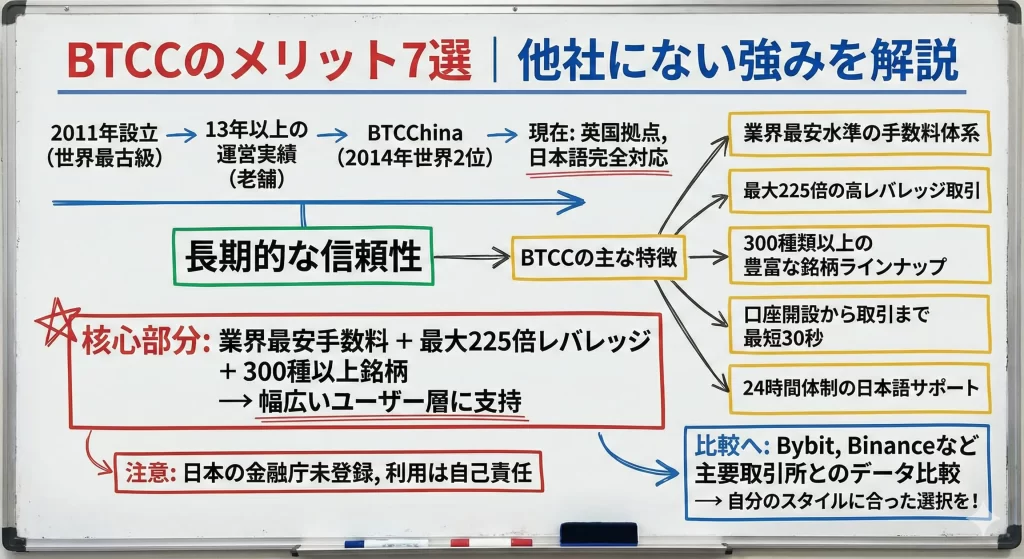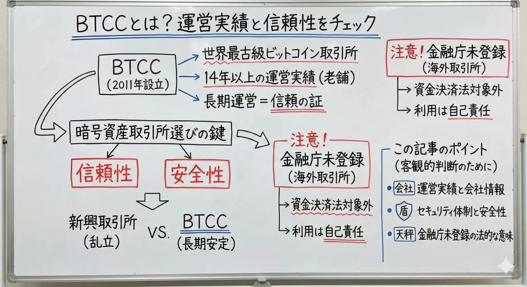 BTCCは2011年創業という長い運営実績を持つ仮想通貨取引所として、一定の信頼性と豊富なサービスを提供している一方で、日本の金融庁未登録という明確なリスクも抱えています。