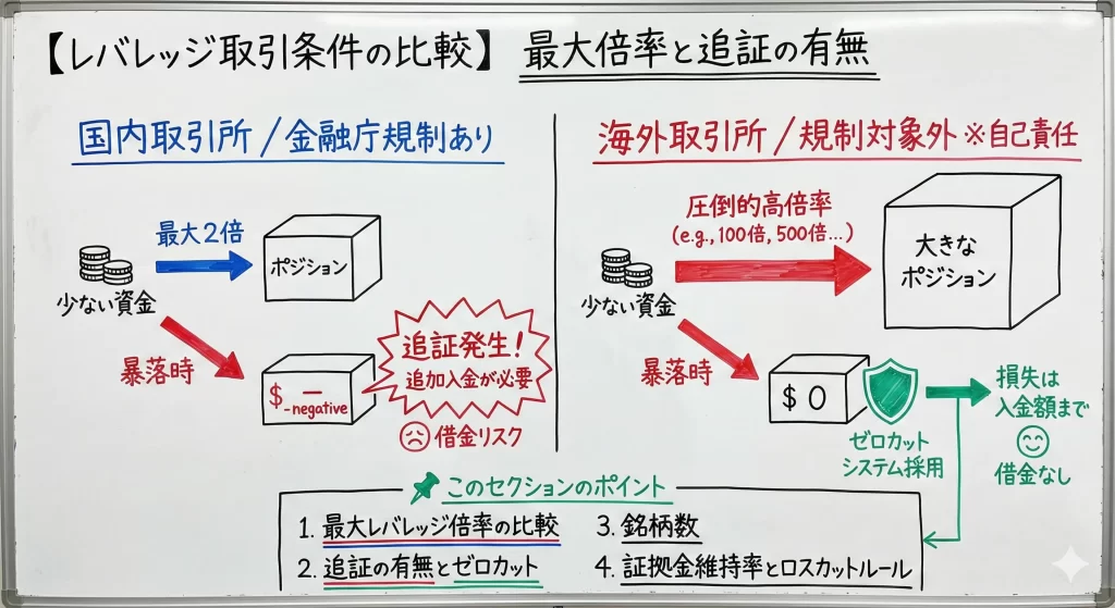 国内取引所の2倍と比べると桁違いですね。ただし、ハイリスク・ハイリターンであることは忘れずに。