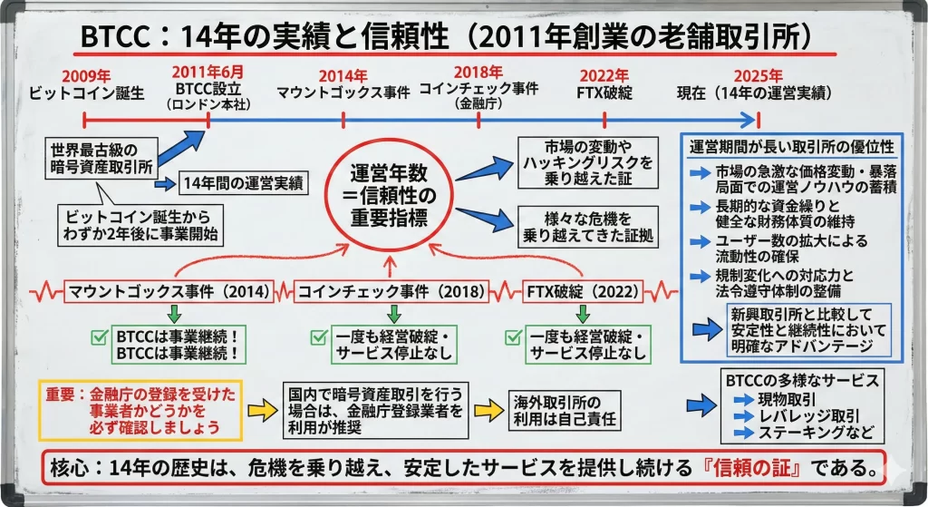 BTCCは2011年に設立された世界最古級の仮想通貨取引所の一つであり、14年以上の運営実績を持つプラットフォームです。