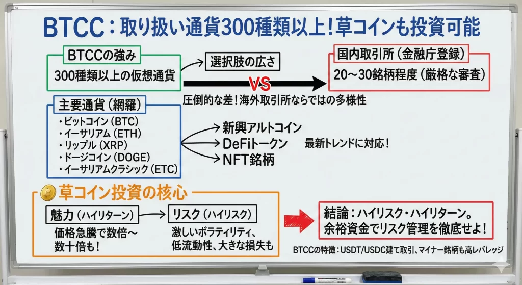 BTCCでは、ビットコインやイーサリアムといった主要通貨はもちろん、様々なアルトコインを含む300種類以上の取引ペアが提供されています。