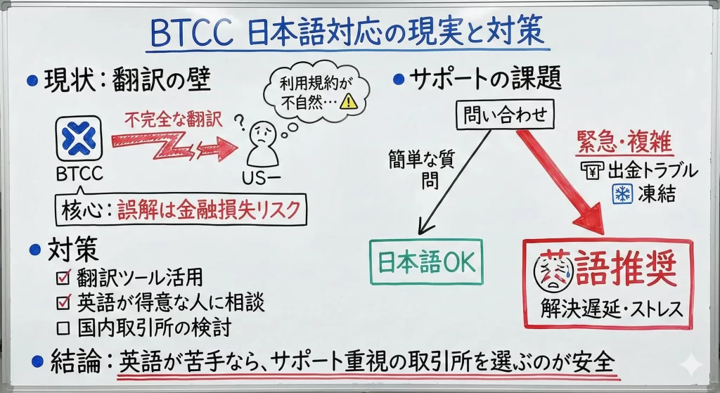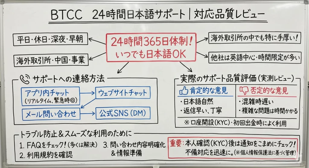 海外取引所の中には日本語対応が不十分でトラブル時に困るケースもありますが、BTCCではそうした心配が比較的少ないと言えます。