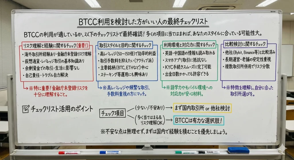 BTCCの利用があなたに適しているかを判断するため、以下のチェックリストで最終確認を行いましょう。