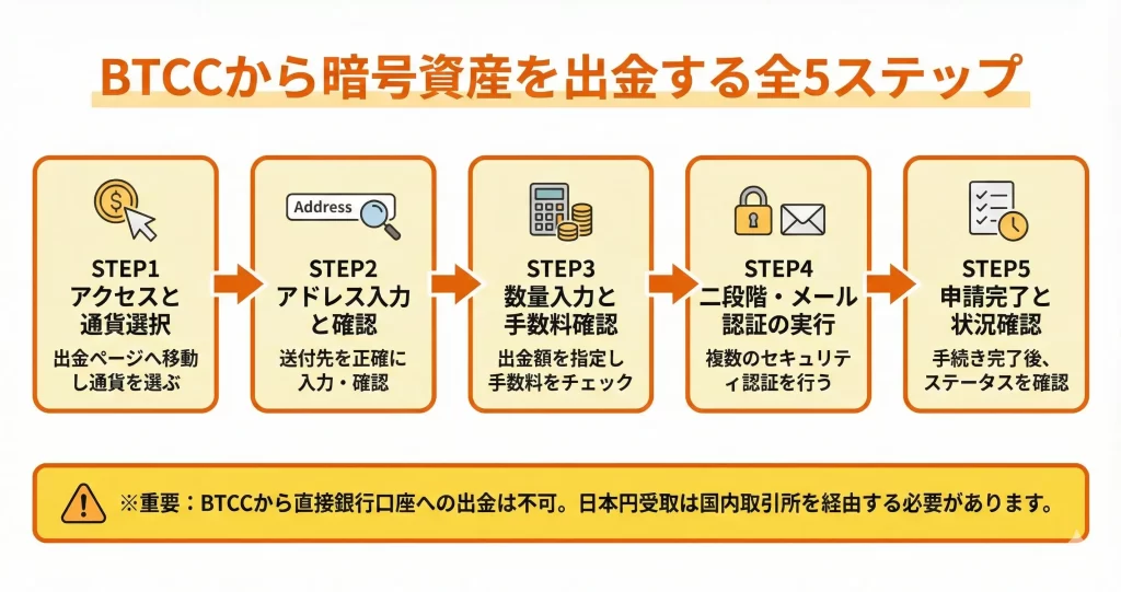 ここでは、BTCC出金から銀行着金までの全体フローを段階ごとに解説します。