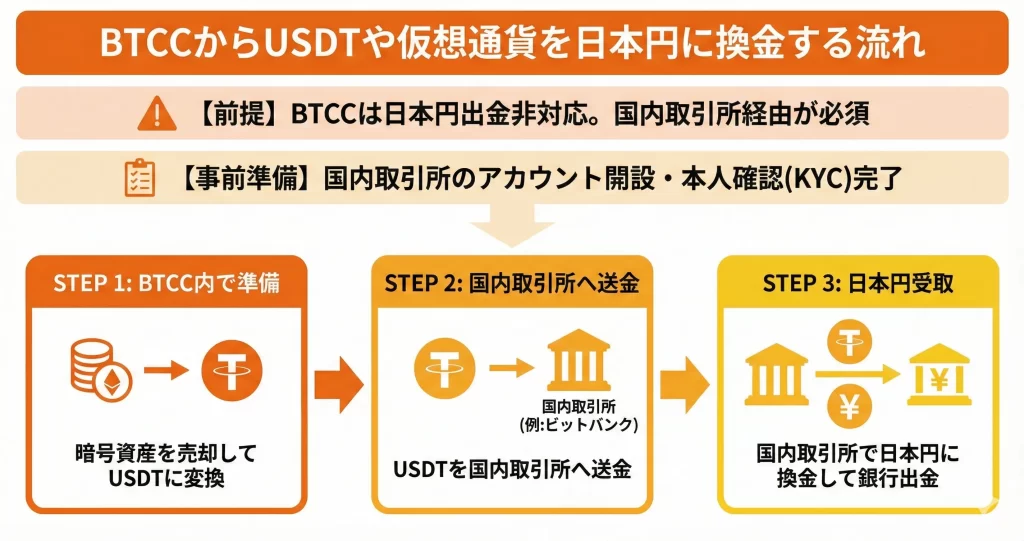 BTCCは海外取引所のため直接日本円への出金には対応していないため、国内取引所を経由する換金ルートの理解が不可欠です。