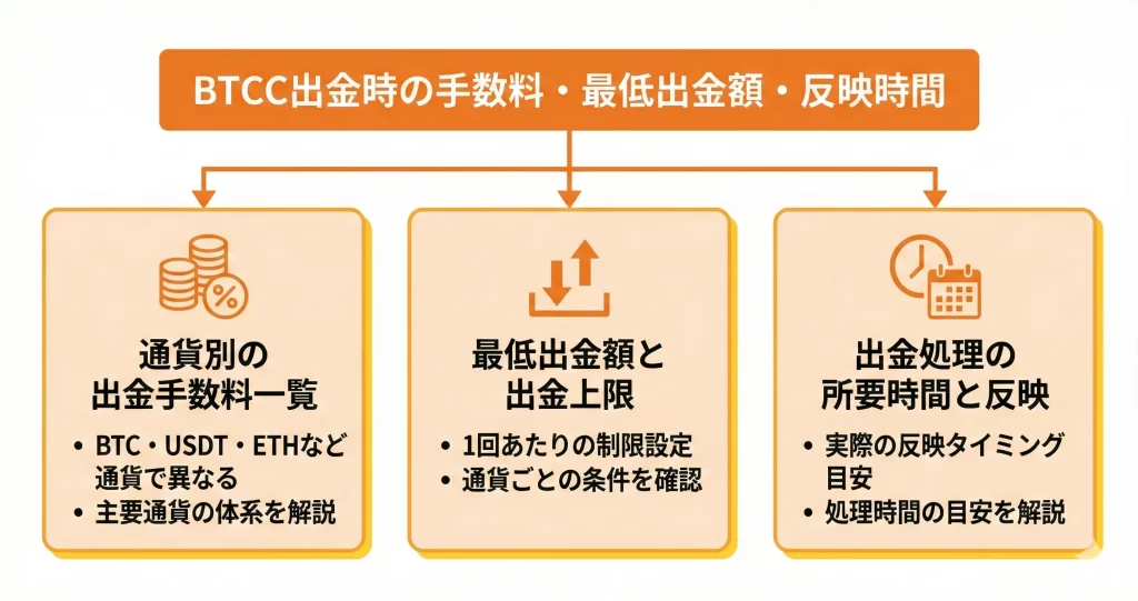このセクションでは、主要通貨の手数料体系・出金の制限条件・実際の反映タイミングについて具体的に解説します。