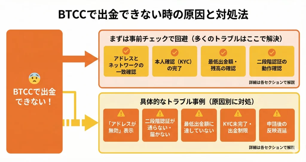 手数料・制限・処理時間の基本を理解したところで、次に気になるのは「出金ができかったときどうすればよいか」という具体的な方法です。次のセクションでは、BTCC出金トラブルとその対処について詳しく解説します。