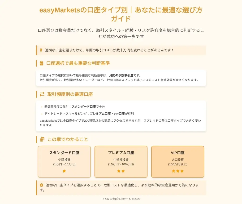 本記事では、easyMarketsが提供する3つの口座タイプの特徴と違いを詳細に解説してきました。