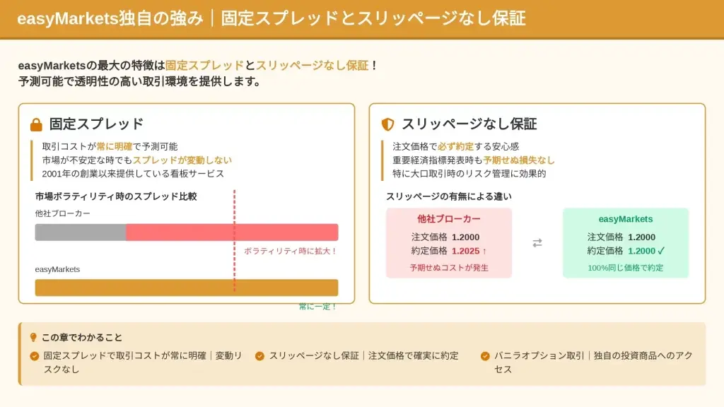 また、easyMarketsは固定スプレッドとスリッページなし保証という独自の強みを持つ海外FX業者として注目を集めています 。