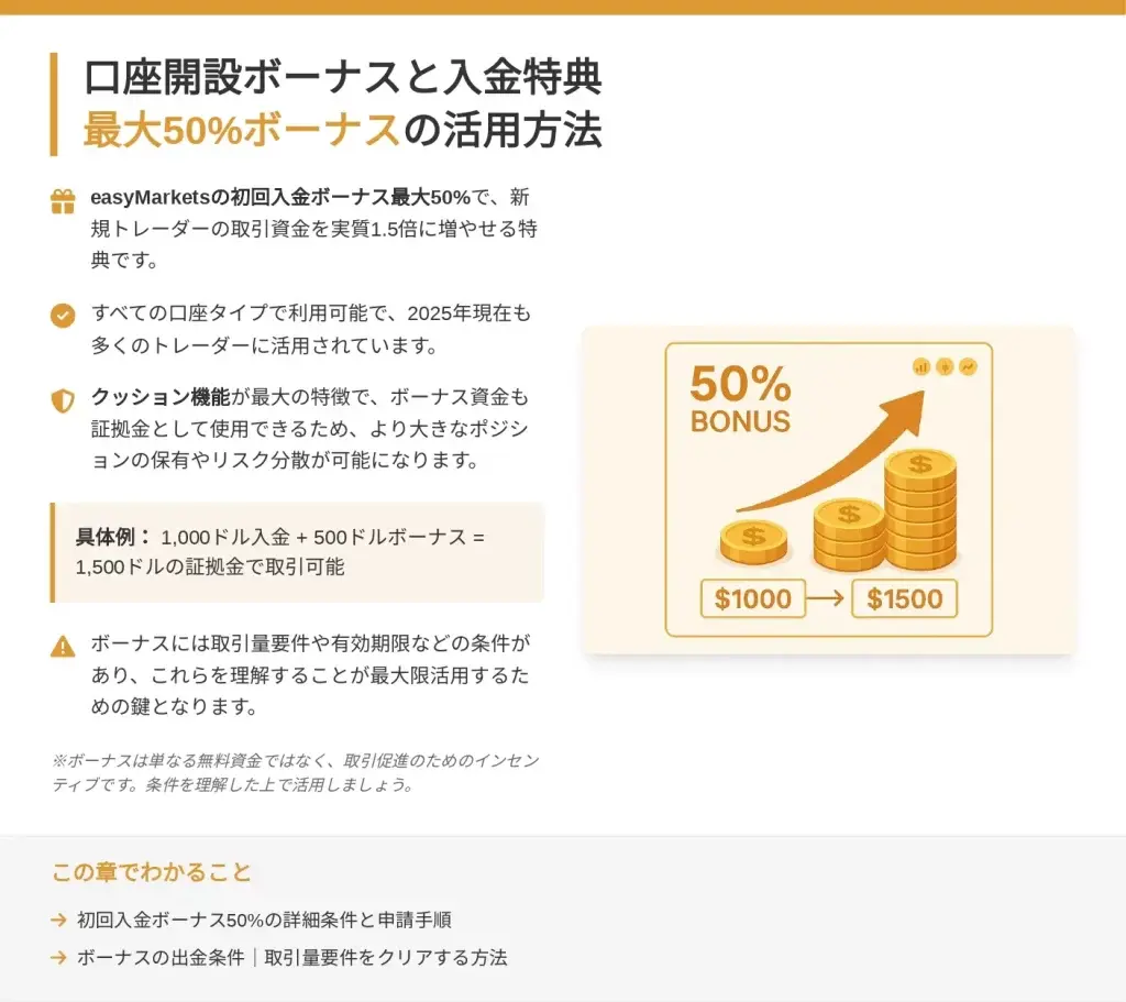 すべての口座タイプで最大50%の初回入金ボーナスが利用可能ですが、ボーナスの取引量要件をクリアできる現実的な取引計画を立てることが重要です。