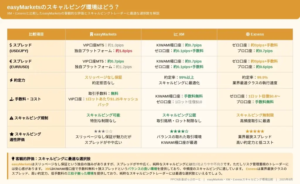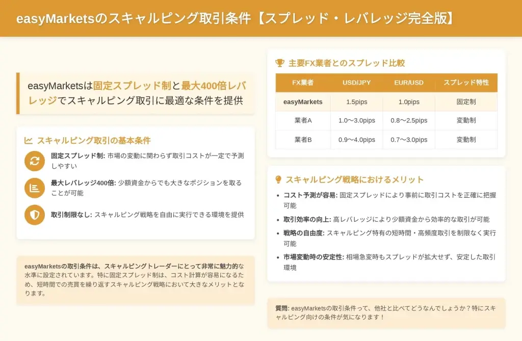 easyMarketsの取引条件って、他社と比べてどうなんでしょうか?特にスキャルピング向けの条件が気になります!