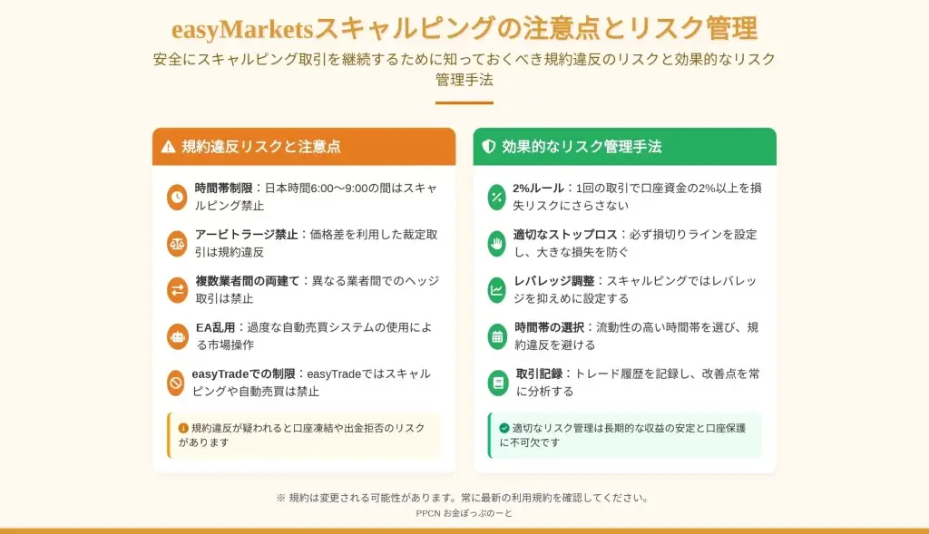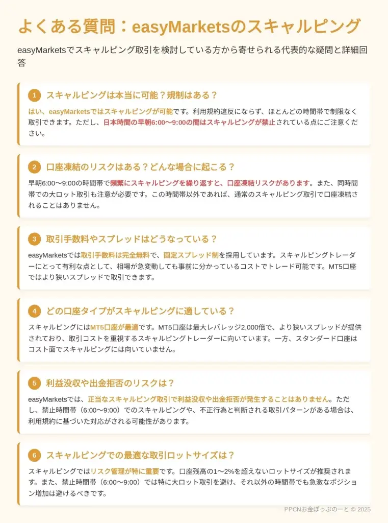 これは同社の公式利用規約(easyMarkets公式サイト)および取引条件書に明記されており、短時間での売買を繰り返す取引スタイルに対して何ら制限を設けていません。