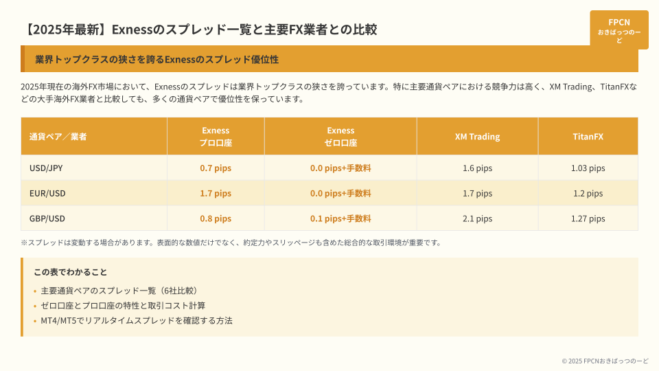 【2025年最新】Exnessのスプレッド一覧と主要FX業者との比較