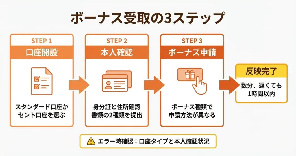 FBSでボーナスを受け取るには、口座開設・本人確認・ボーナス申請の3ステップを順番に完了させる必要があります。