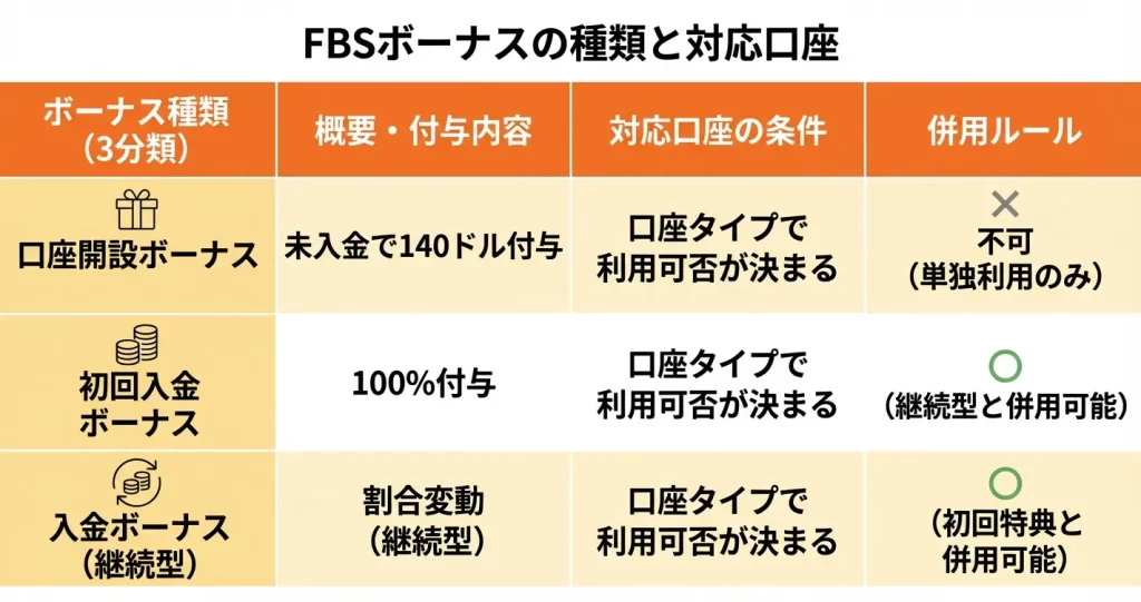 FBSが提供しているボーナスは、大きく分けて新規ユーザー向けの初回特典と、既存ユーザーも対象となる入金連動型の特典に分類されます。