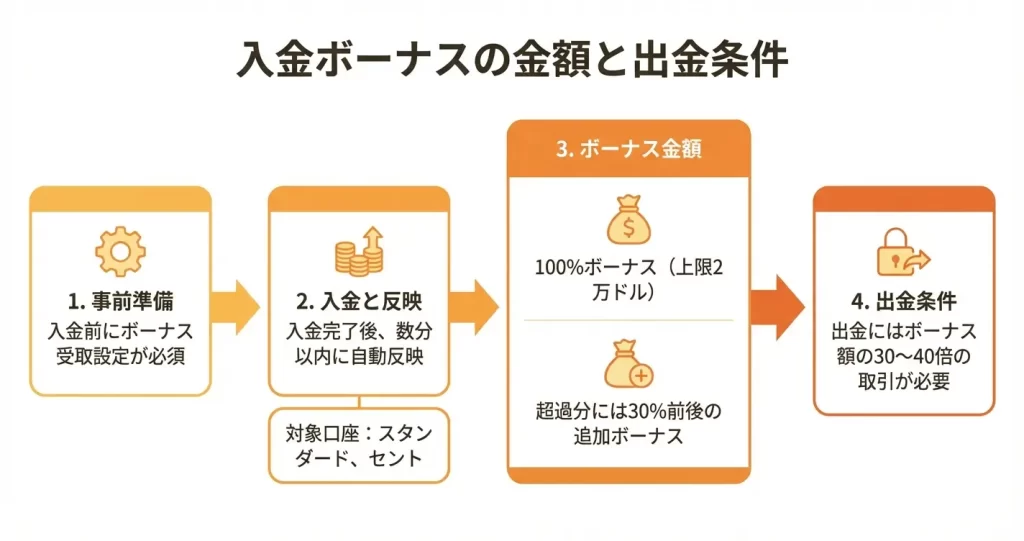 このセクションでは、100%入金ボーナスの対象額と上限、追加で受け取れるボーナスの仕組み、反映タイミング、そして出金に必要な取引条件を順に整理します。
