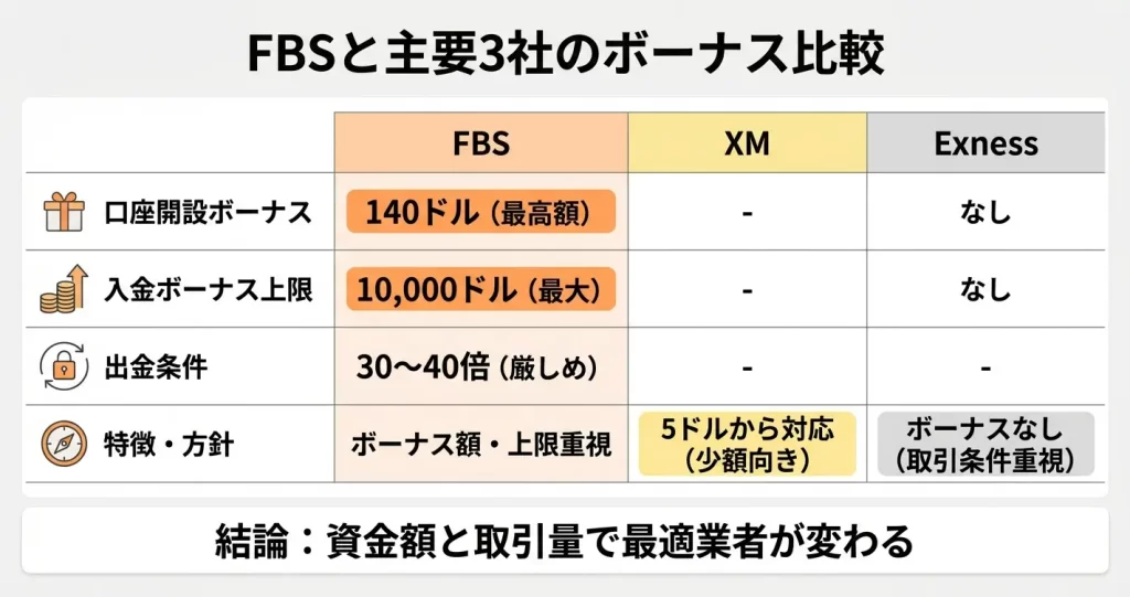 ボーナス額や対象口座は時期によって変動する場合があるため、登録前にFBS公式サイトで最新の条件を確認する必要があります。