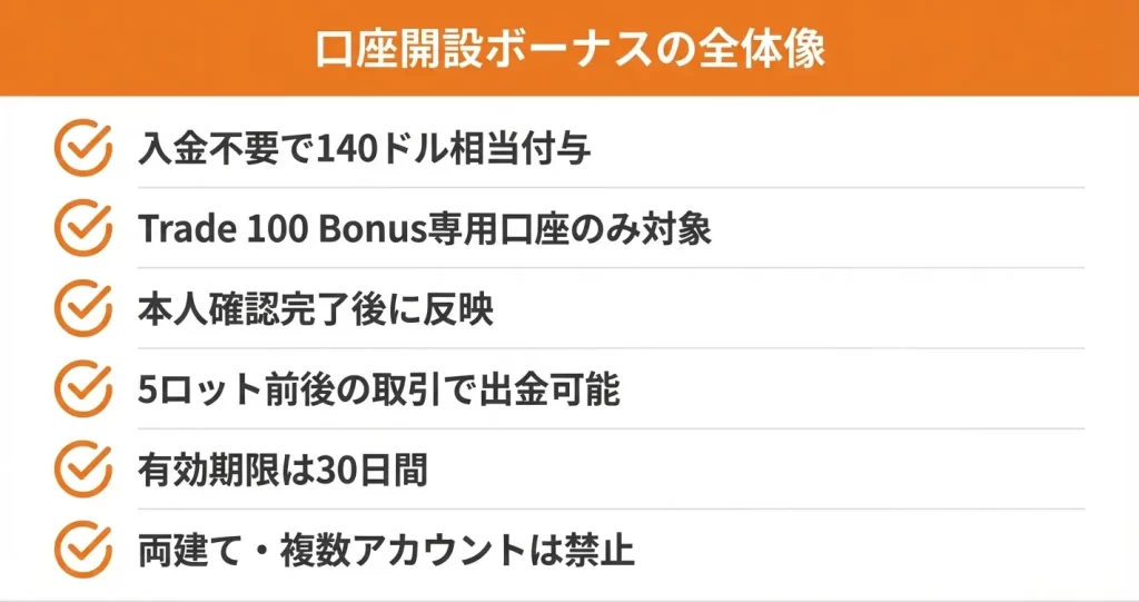 ここでは、ボーナスの金額・対象口座・受取手順から出金条件まで、実務上必要な情報を順に整理します。