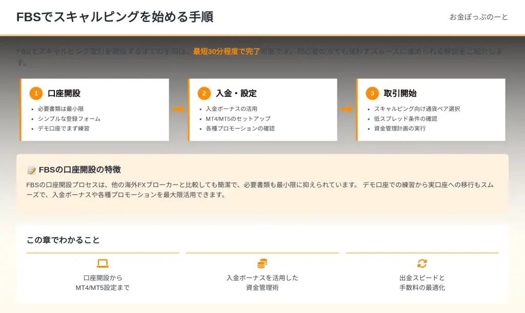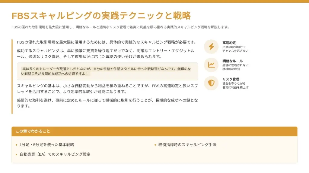 FBSでのスキャルピング取引について、取引条件、口座タイプの選択、実践的な戦略、そして始め方まで詳しく解説してきました。