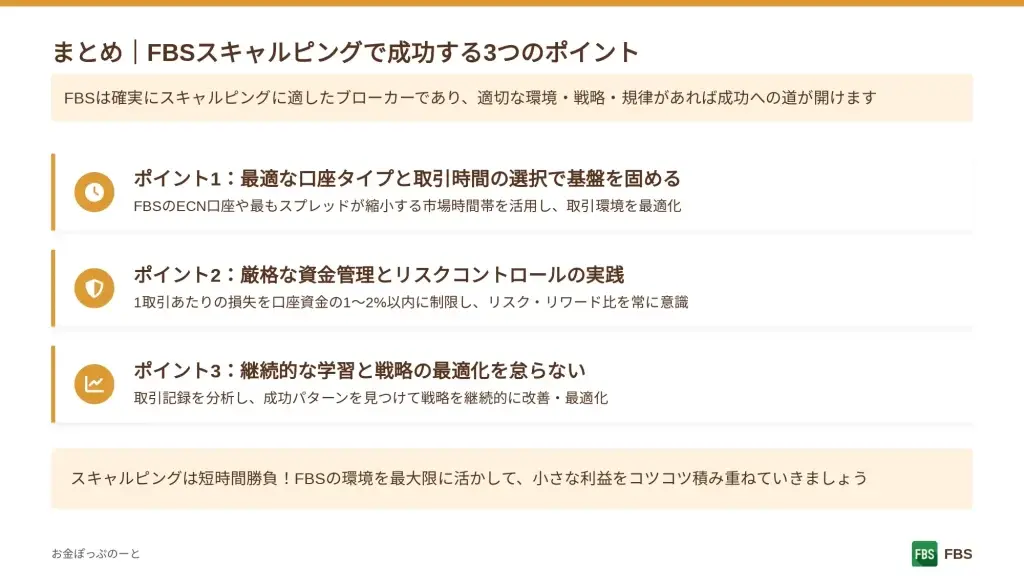最後に、FBSでスキャルピングを成功させるための最も重要な3つのポイントを整理し、これから取引を始める方、あるいは既に取引をしている方が、より効果的に利益を上げるための指針をまとめます。
