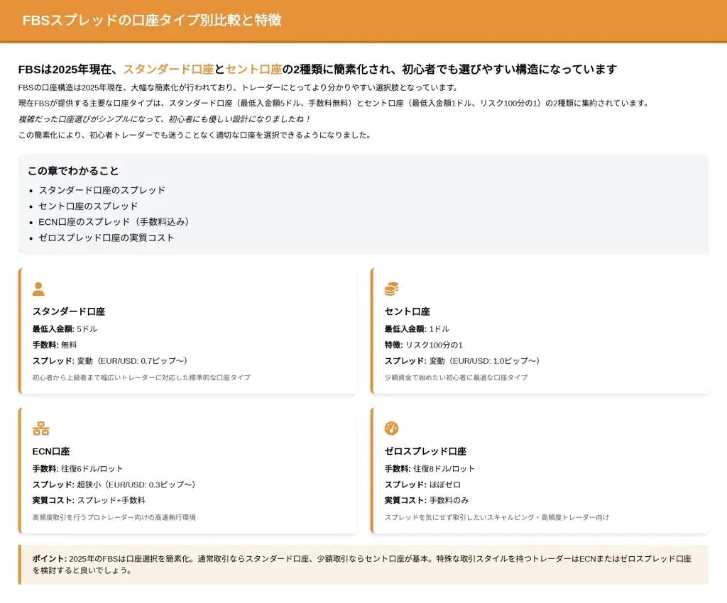 FBSの口座構造は2025年現在、大幅な簡素化が行われており、トレーダーにとってより分かりやすい選択肢となっています。