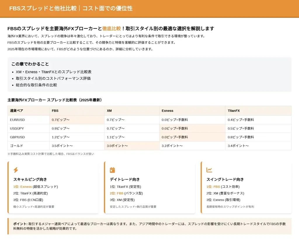 本記事では、FBSの全口座タイプ(スタンダード・セント・ECN・ゼロスプレッド)における主要通貨ペアの最新スプレッドデータを一覧化し、XM・Exness・TitanFXなど主要他社との詳細な比較表を提供します。