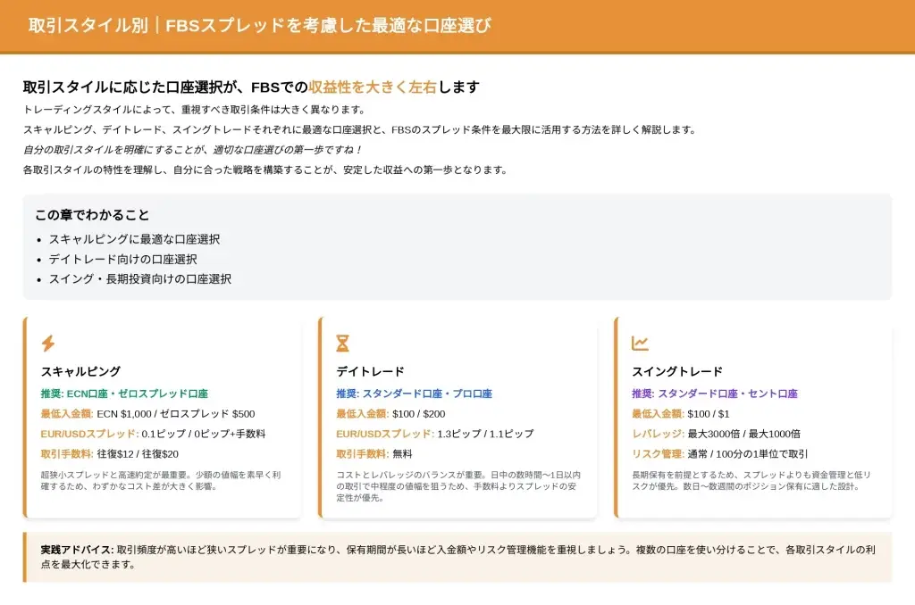 この記事を読めば、あなたの取引スタイルに最適なFBSの口座タイプが明確になり、スプレッドコストを最小化しながら利益を最大化する具体的な方法を実践できるようになります。