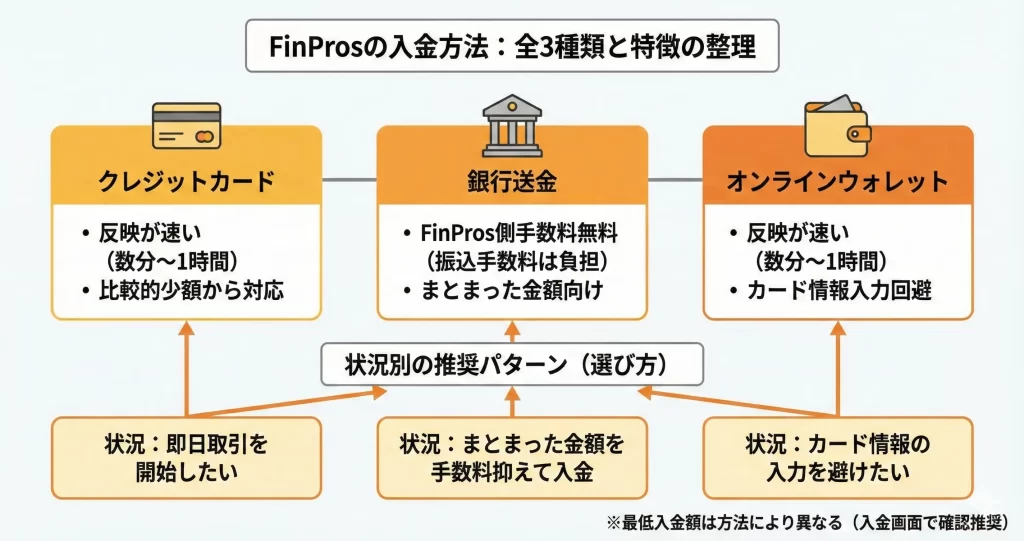 FinProsでは、クレジットカード・銀行送金・オンラインウォレットの3種類から入金方法を選択できます。それぞれ反映時間や手数料、利用可能な金融機関が異なるため、自分の状況に合った方法を選ぶことが重要です。
