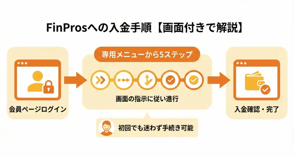 FinProsの入金操作は、会員ページにログイン後、専用メニューから5つのステップで完了します。