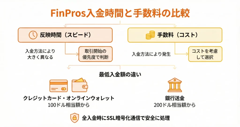FinProsでは銀行振込、クレジットカード、オンラインウォレットの3つの方法が用意されており、それぞれ反映時間や手数料が異なります。