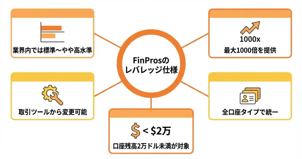 FinProsでは最大レバレッジ1000倍が提供されており、全ての口座タイプで同一のレバレッジ条件が適用されます。