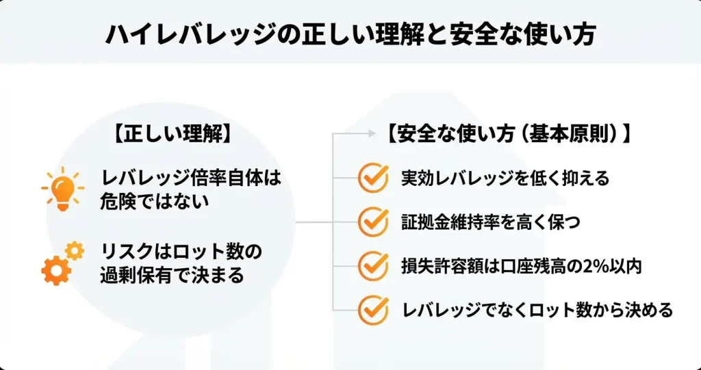 レバレッジの安全性は、口座の最大倍率ではなく実効レバレッジで判断します。