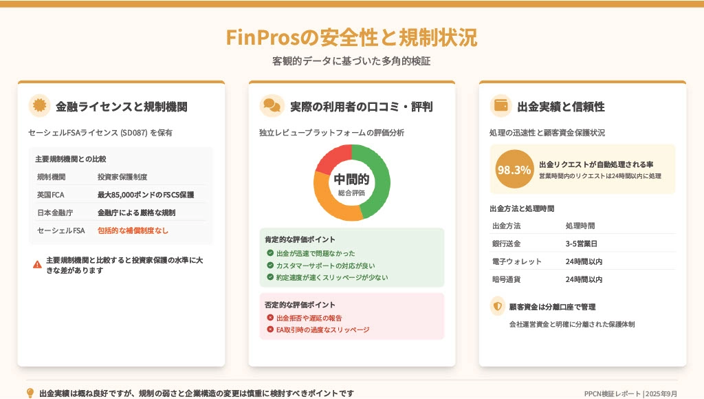 FinProsはセーシェル金融サービス機構(FSA)のライセンス(SD087)のみを保有しており、これはオフショア規制に分類されます。