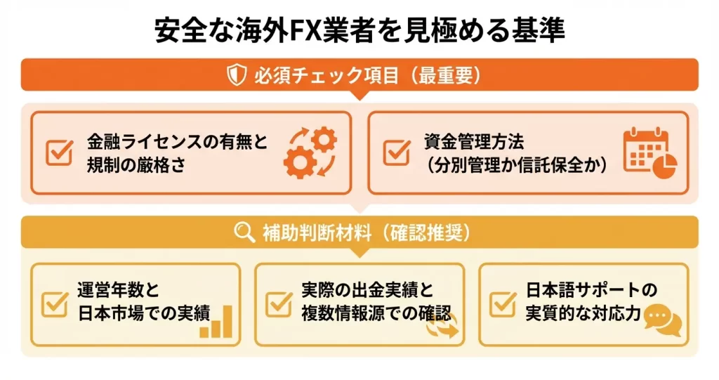 「絶対に安全」な海外FX業者は存在せず、複数の基準で総合的に判断する必要があります。