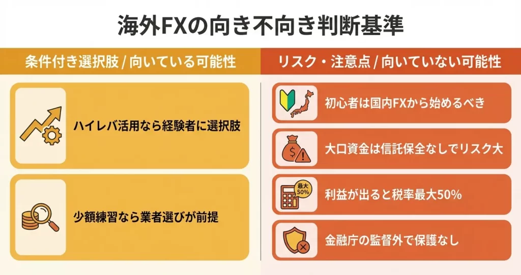 次のセクションでは、これまでの内容を踏まえて、海外FXを利用すべきかどうかの判断基準を整理します。