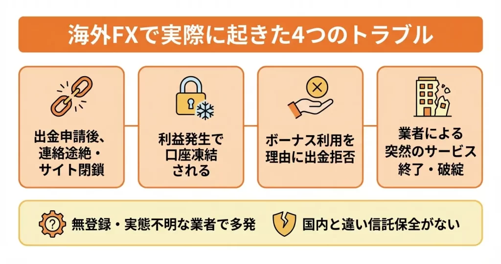 海外FXを利用する上で最も知っておくべきなのは、実際に発生したトラブルの具体的な内容です。出金拒否や業者の突然の消失など、個人投資家が被害を受けた事例は国内外で複数報告されています。