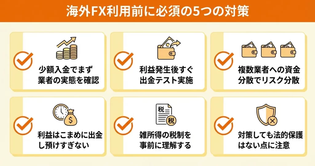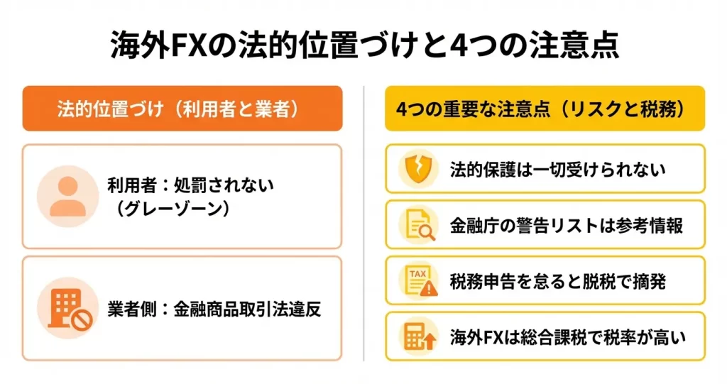 海外FX業者の利用は自己責任となり、トラブル時の法的保護は国内業者より限定的です