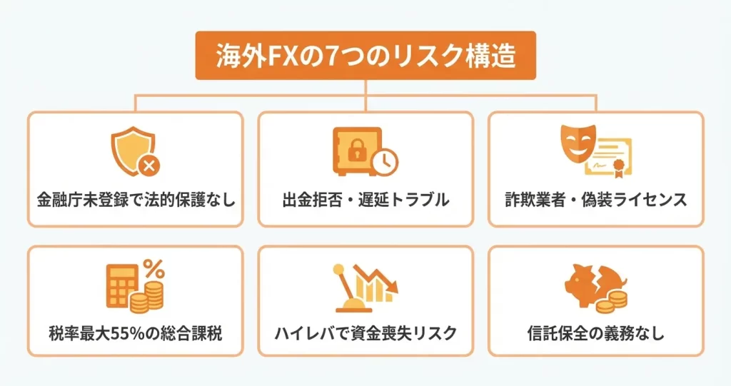 これらのトラブル事例を踏まえると、海外FX業者を選ぶ際には何を基準に判断すべきかが重要になります。次のセクションでは、海外FXが持つ構造的なリスクを7つの観点から整理し、なぜこうしたトラブルが発生しやすいのかを解説します。
