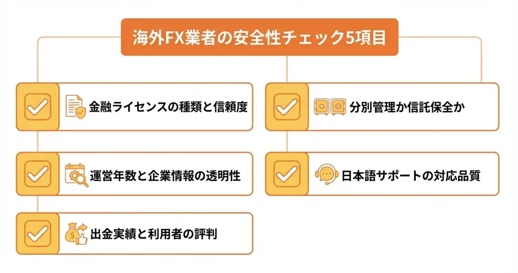 海外FX業者の安全性は、感覚的な印象ではなく具体的な指標で評価できます。