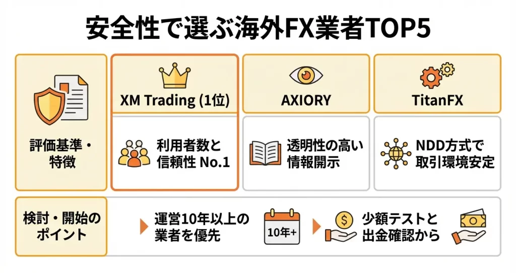 ここまでで、ライセンスや運営実績、そして実際の利用者の声から見る安全性の判断軸を整理しました。次のセクションでは、これらを踏まえて具体的にどの業者を選ぶべきか、安全性の高い海外FX業者のランキング形式で紹介します。