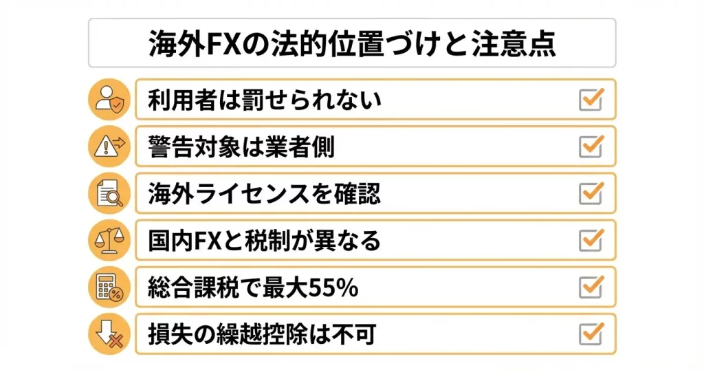 海外FX業者の利用自体は違法ではなく、個人が取引を行っても処罰の対象にはなりません。