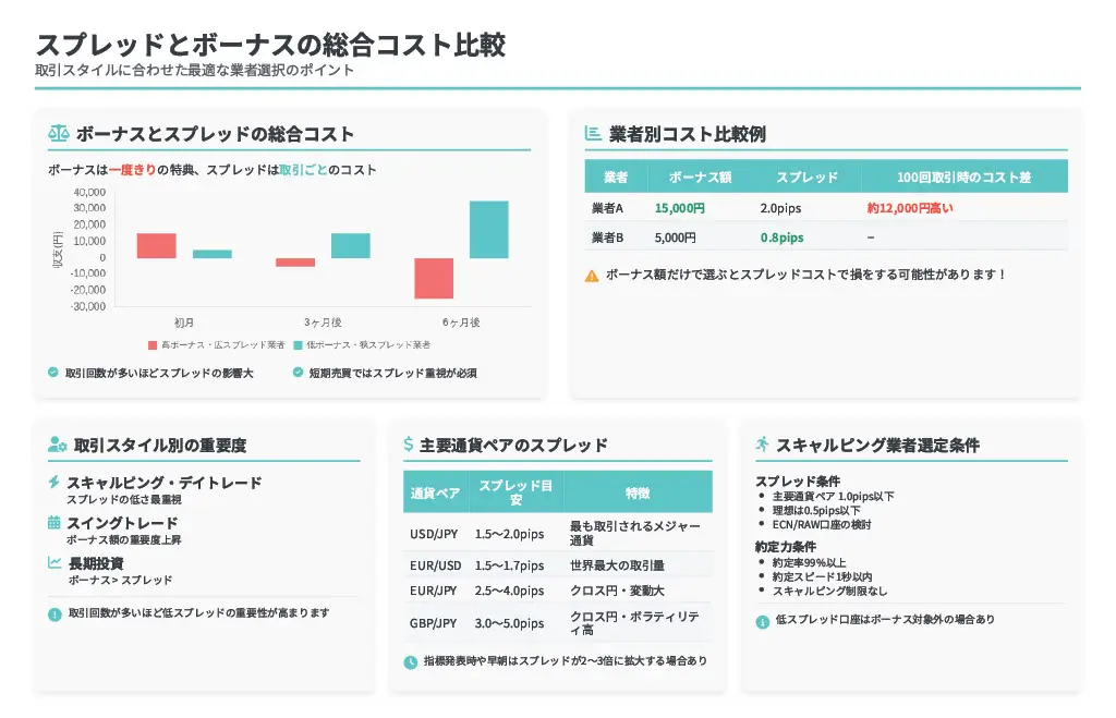 ボーナスが大きくても、出金条件が厳しすぎたりスプレッドが広すぎると結果的に不利になることもあります。トレードスタイルに合わせた業者選びが成功の鍵です。