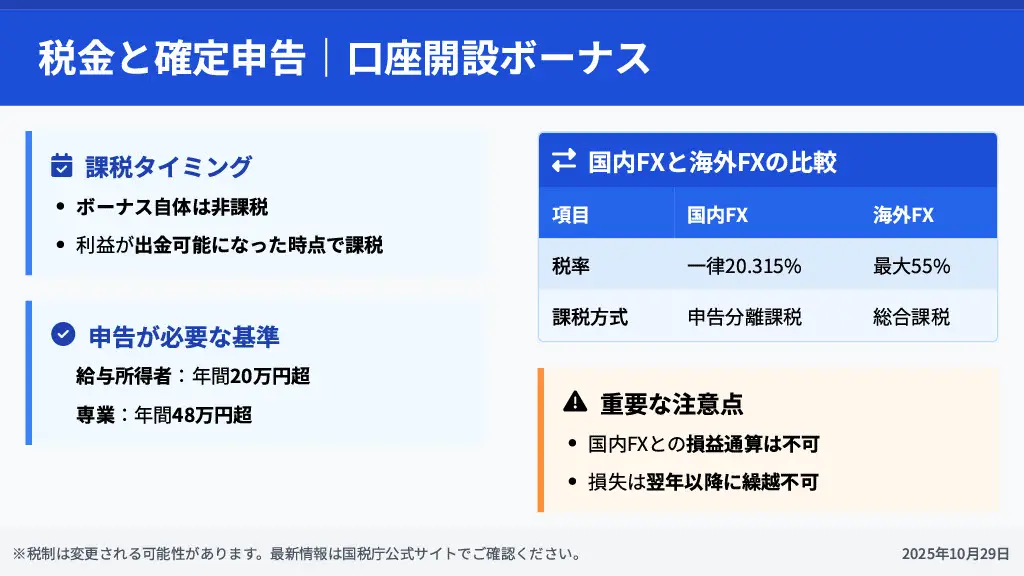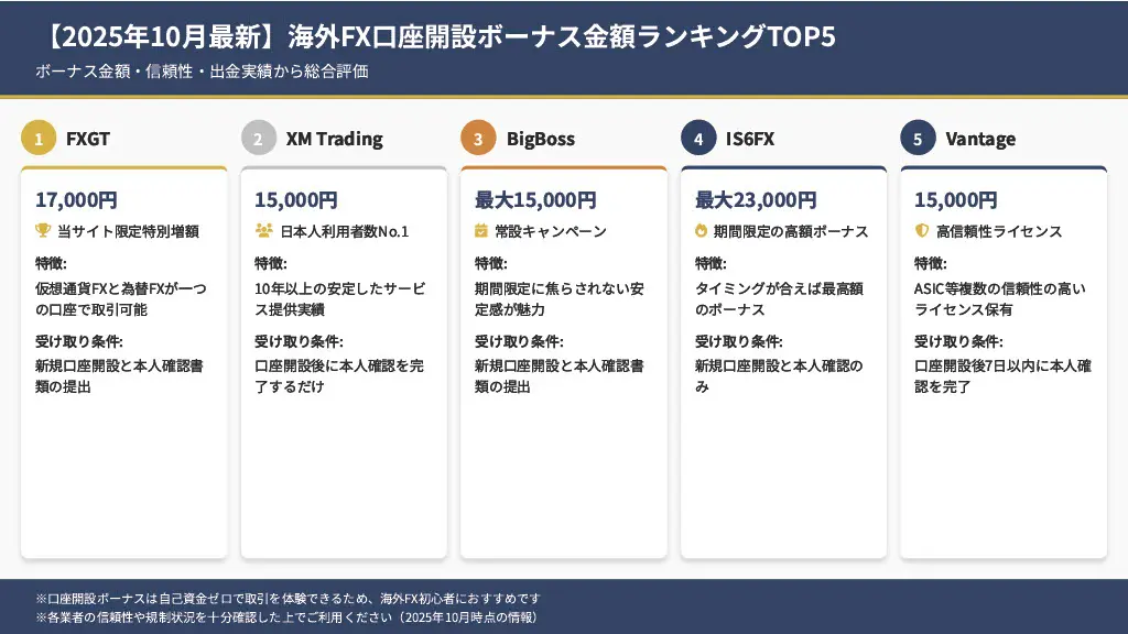 2025年10月現在、主要な海外FX業者では3,000円から15,000円程度の口座開設ボーナスを提供しています。