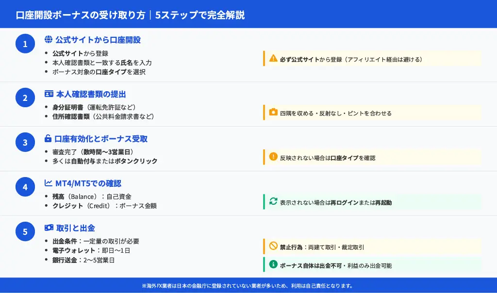 さらに、口座開設から本人確認、ボーナス受け取り、利益出金までの具体的な5ステップを画像付きで解説。