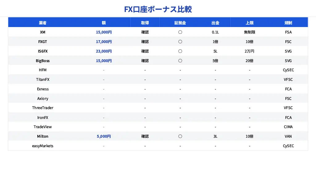 XMやFXGTなど高額ボーナスを提供する業者は魅力的ですが、スプレッドの広さ・出金条件のロット数・約定力・サポート体制など総合的な視点で比較する必要があります。