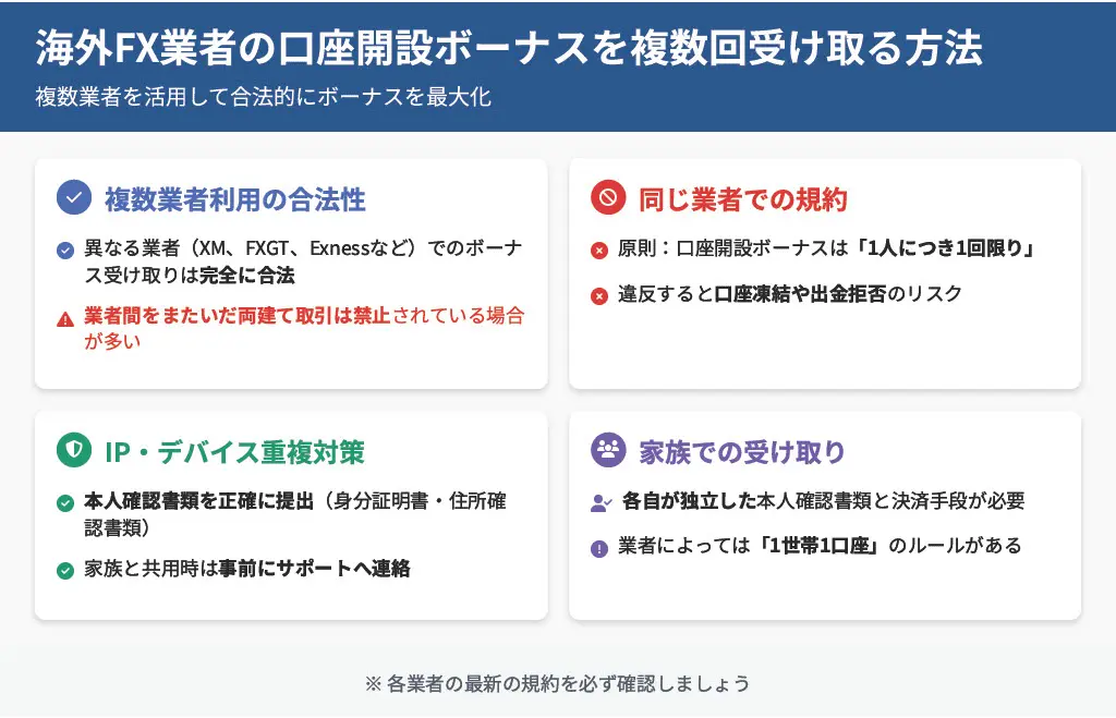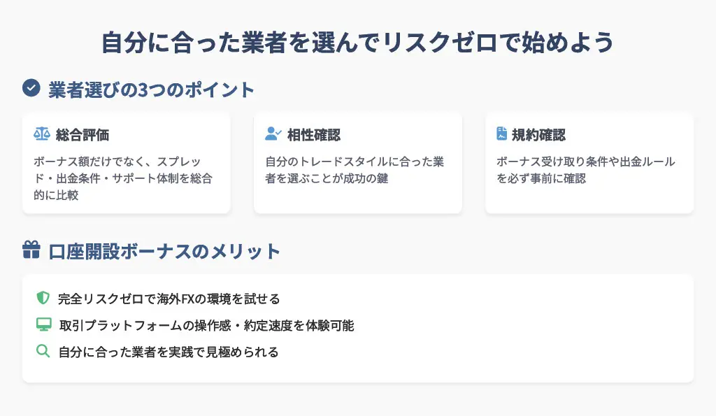 本記事では、主要業者のボーナス金額・条件・信頼性を比較し、受け取り方法から出金までの具体的な手順、さらに複数業者を活用する戦略まで幅広く解説してきました。