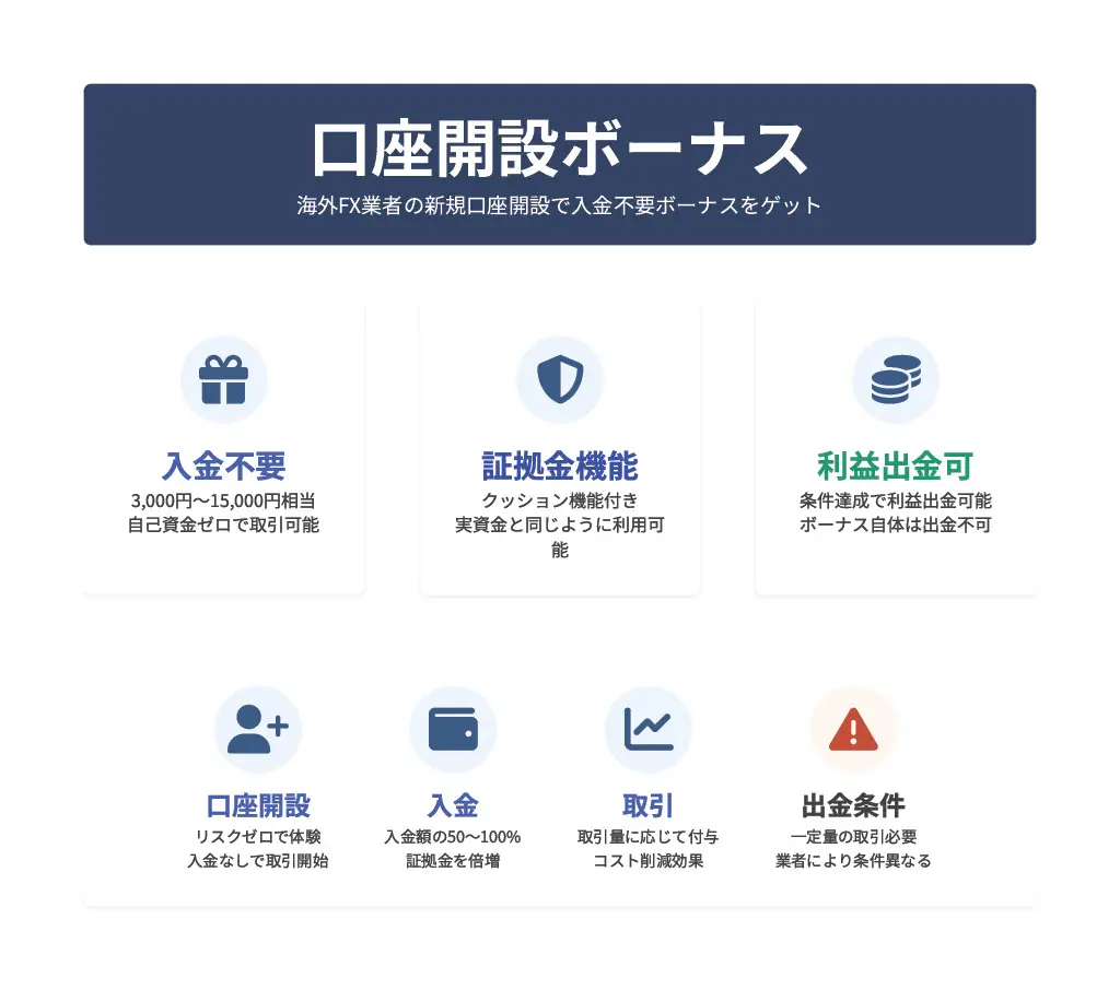 口座開設ボーナスは完全リスクゼロで海外FXの環境を試せる制度です。