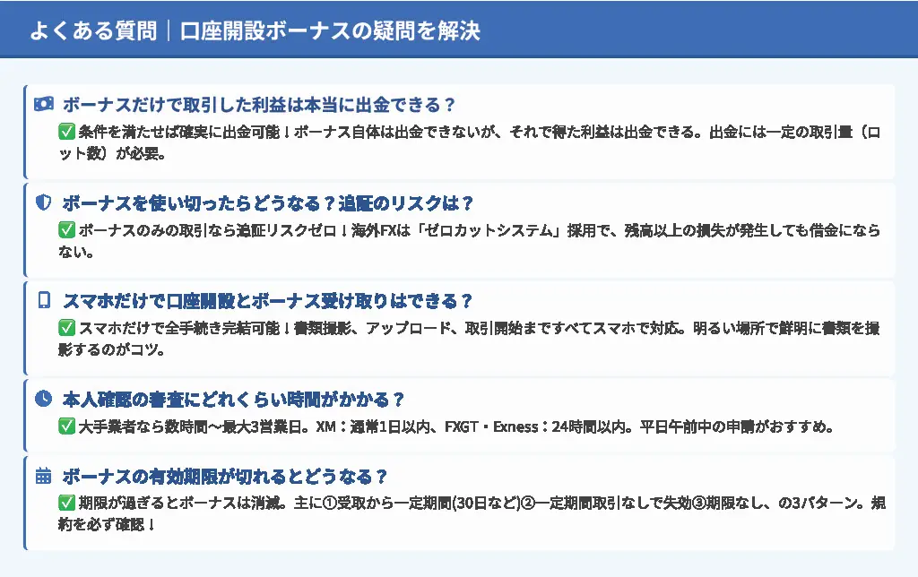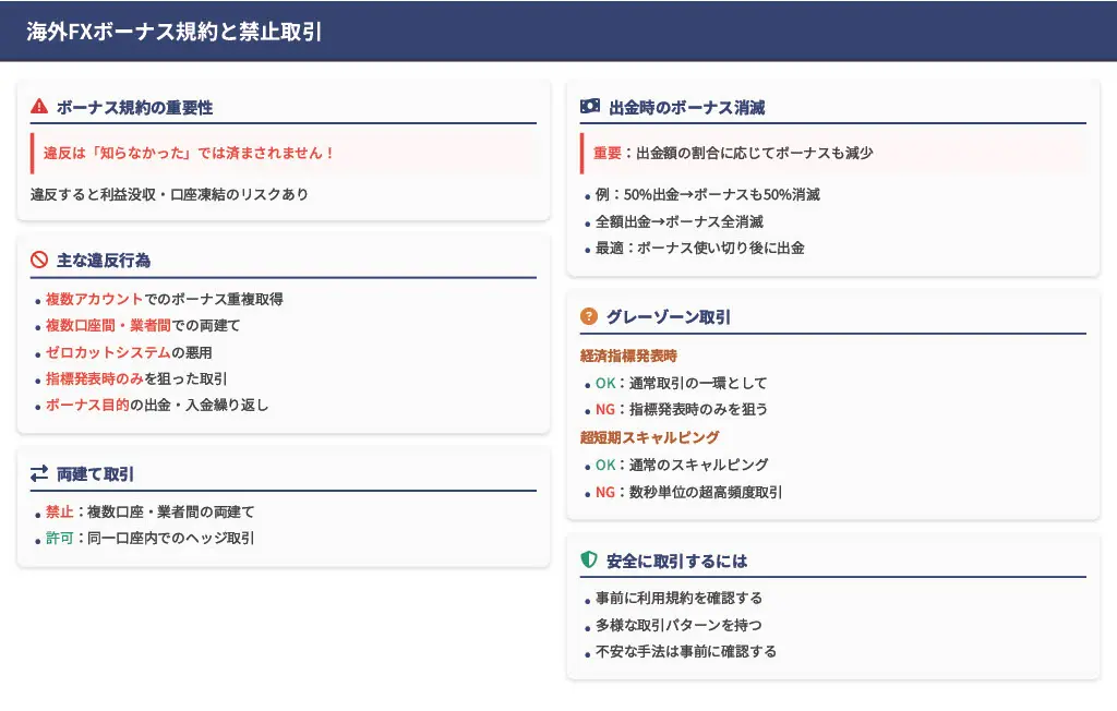 ボーナスが反映されない時の対処法、出金条件を効率的にクリアする取引方法、禁止取引で口座凍結にならないための注意点、2回目以降のボーナス獲得テクニックまで網羅しています。