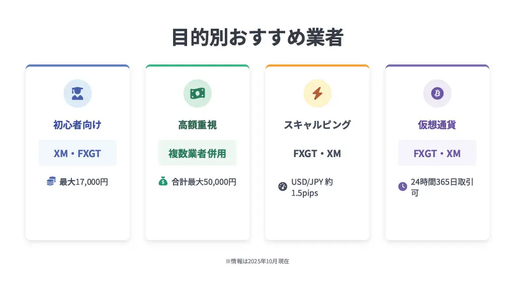 初心者であれば日本語サポートが充実し運営歴の長い業者、スキャルピング中心なら低スプレッド業者、ボーナス重視なら複数業者の併用といった具合に、自分のトレードスタイルと目的に合わせて選択しましょう。